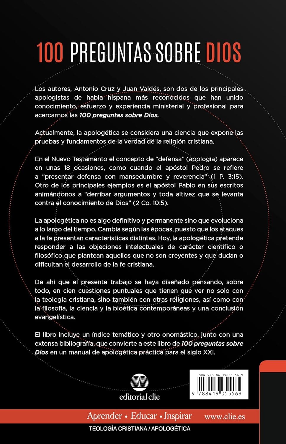 Antonio Cruz y Juan Valdés, principales apologistas de habla hispana, han unido conocimiento, esfuerzo y experiencia ministerial y profesional para responder las 100 preguntas más fundamentales y populares sobre Dios. Con una amplia selección de temas sobre la teología, la religión, la filosofía, la ciencia y la bioética, todos respondidos desde principios bíblicos fundamentales, encontrarás un estudio exhaustivo y convincente sobre uno de los temas más importantes de la vida del cristiano de hoy: la apologética. En 100 preguntas sobre Dios, los autores demuestran convincentemente que las verdades bíblicas son definitivas, mostrando que diversas disciplinas de la ciencia y del pensamiento humano confirman la veracidad de un ser divino y absoluto, tal como afirma la Biblia. Este libro, un compendio de las principales inquietudes que plantea el mundo moderno al cristianismo contemporáneo, incluye: Un conveniente índice temático Un listado de referencias Un catálogo onomástico de nombres propios Extensas reseñas bibliográficas Conclusiones evangelísticas para cada pregunta