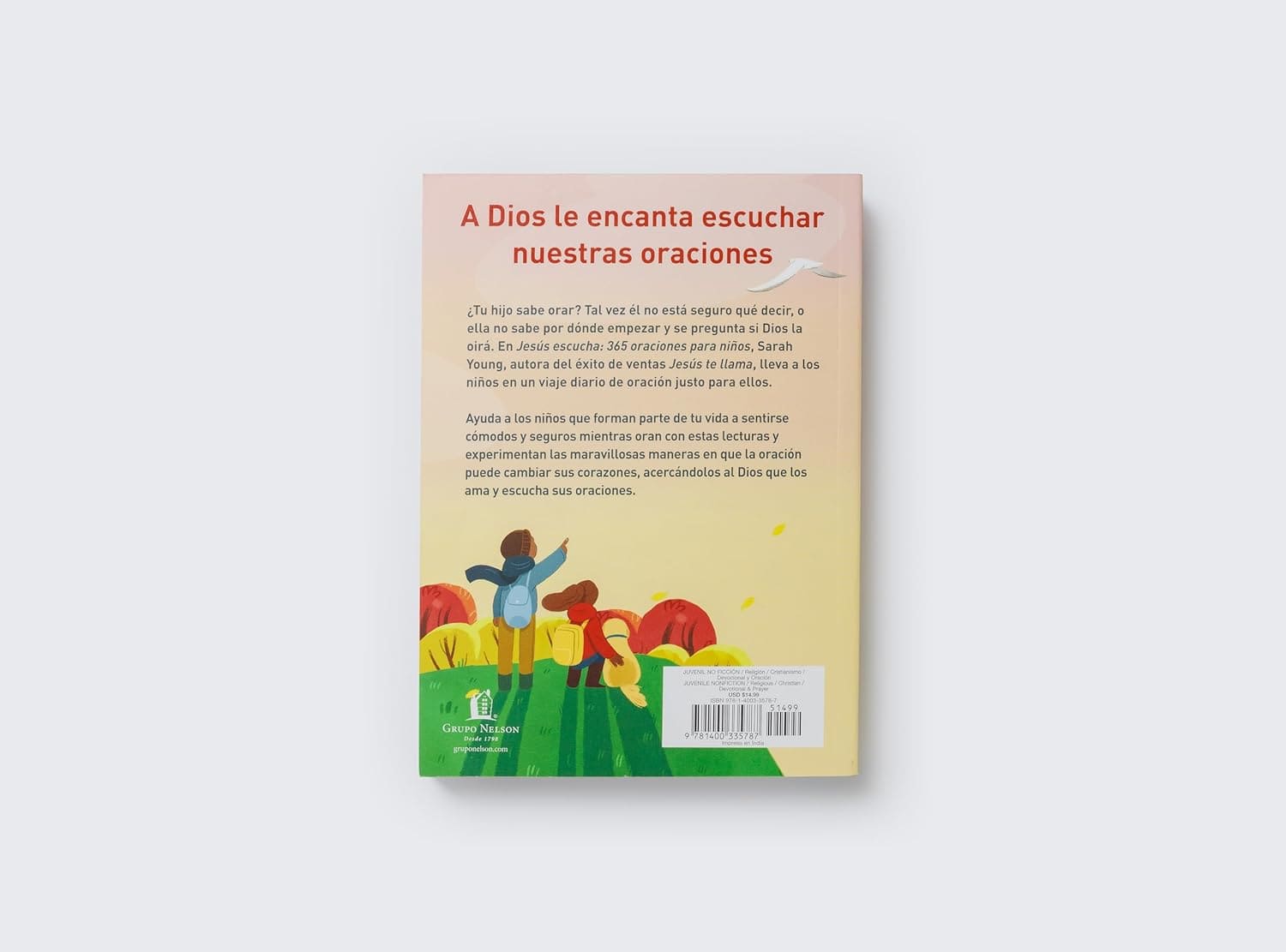 En este inspirador libro de oraciones de 365 días, Sarah Young, autora de Jesús te llama, ayuda a los niños a hablar con Dios cada día. Ellos aprenderán a hacer oraciones sinceras y a saber que Jesús siempre los escucha. Este libro equipará a los padres que quieran: enseñar a sus hijos a orar y hablar con Dios; asegurar a sus hijos que Dios está siempre con ellos; ayudar a sus hijos a leer versículos de la Biblia todos los días. Los niños aprenderán la práctica diaria de leer la Palabra de Dios y hablar con él. Sabrán que pueden: hablar con Jesús sobre cualquier cosa y acudir a él cuando tengan miedo, ansiedad o preocupación; aprender a agradecer y alabar a Dios, y aprender a presentarle sus peticiones; desarrollar el hábito de la oración. Este libro inspirador para niños de 8 a 12 años es un regalo perfecto para Navidad cumpleaños celebraciones de graduación y regreso al colegio bautismos, premios de la escuela dominical o primeras comuniones Jesús escucha: 365 oraciones para niños es una herramienta maravillosa para ayudar a sus hijos a leer las Escrituras y orar todos los días del año.